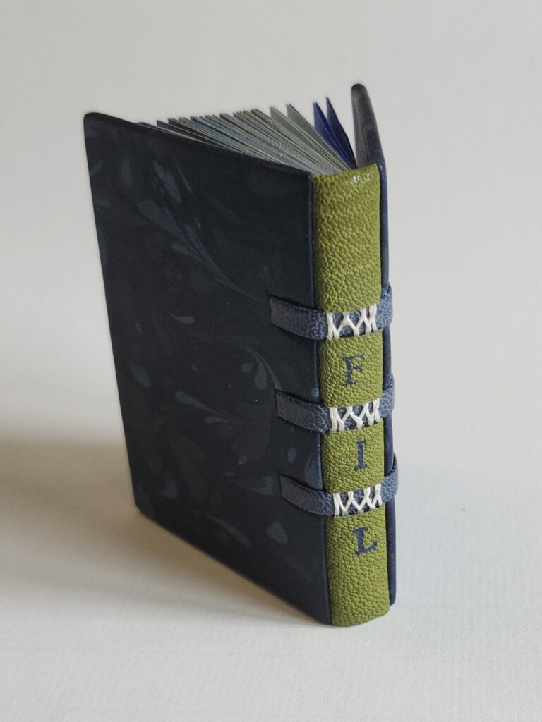 Fil, poème de Louise Warren, reliure et édition par Catherine Savignac, 2025. Exemplaire unique. Présenté à Petites Merveilles. Exposition internationale de reliures de création miniatures, au Musée des métiers d’art du Québec, du 1er au 30 novembre 2025.
